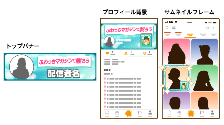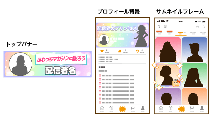 後半の「推しデコレーション(男性)」「推しデコレーション(女性)」各グループの対象順位で入賞した配信者に対して、有料アイテム【ふわっちマガジン】の使用個数が多かった上位10名の視聴者に、視聴者特典として配信者とお揃いのプロフィール背景をプレゼントいたします。