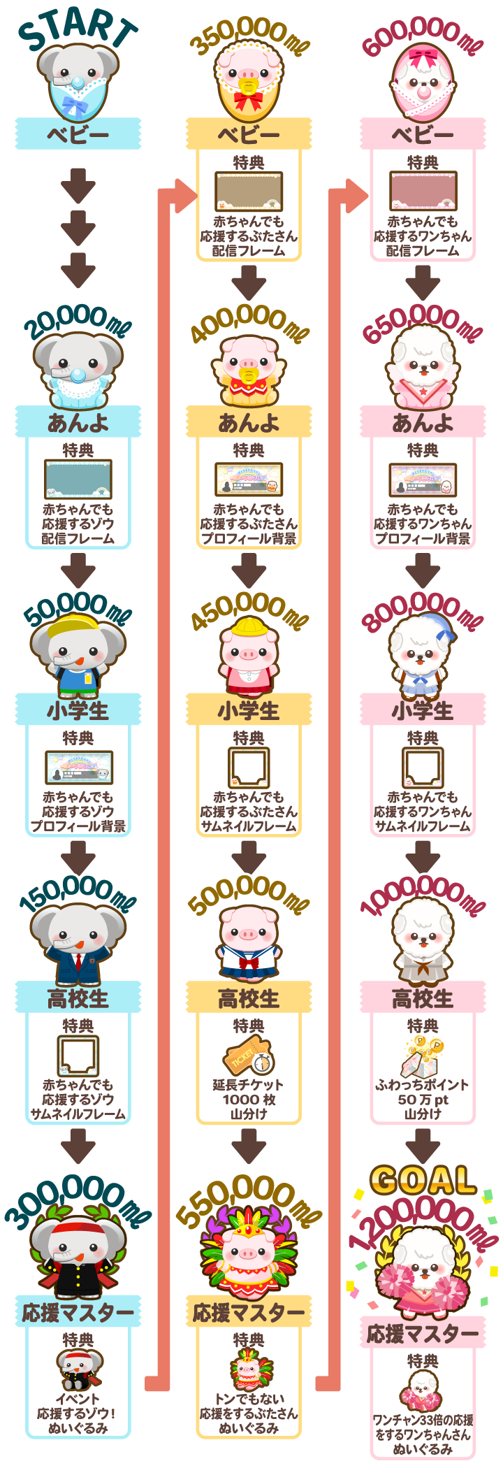 - イベント期間中に「ベビーカー」「イベント応援するゾウ!」「トンでもない応援をするぶたさん」「ワンチャン33倍の応援をするワンちゃんさん」をWebで購入でもらえるおまけアイテムです。