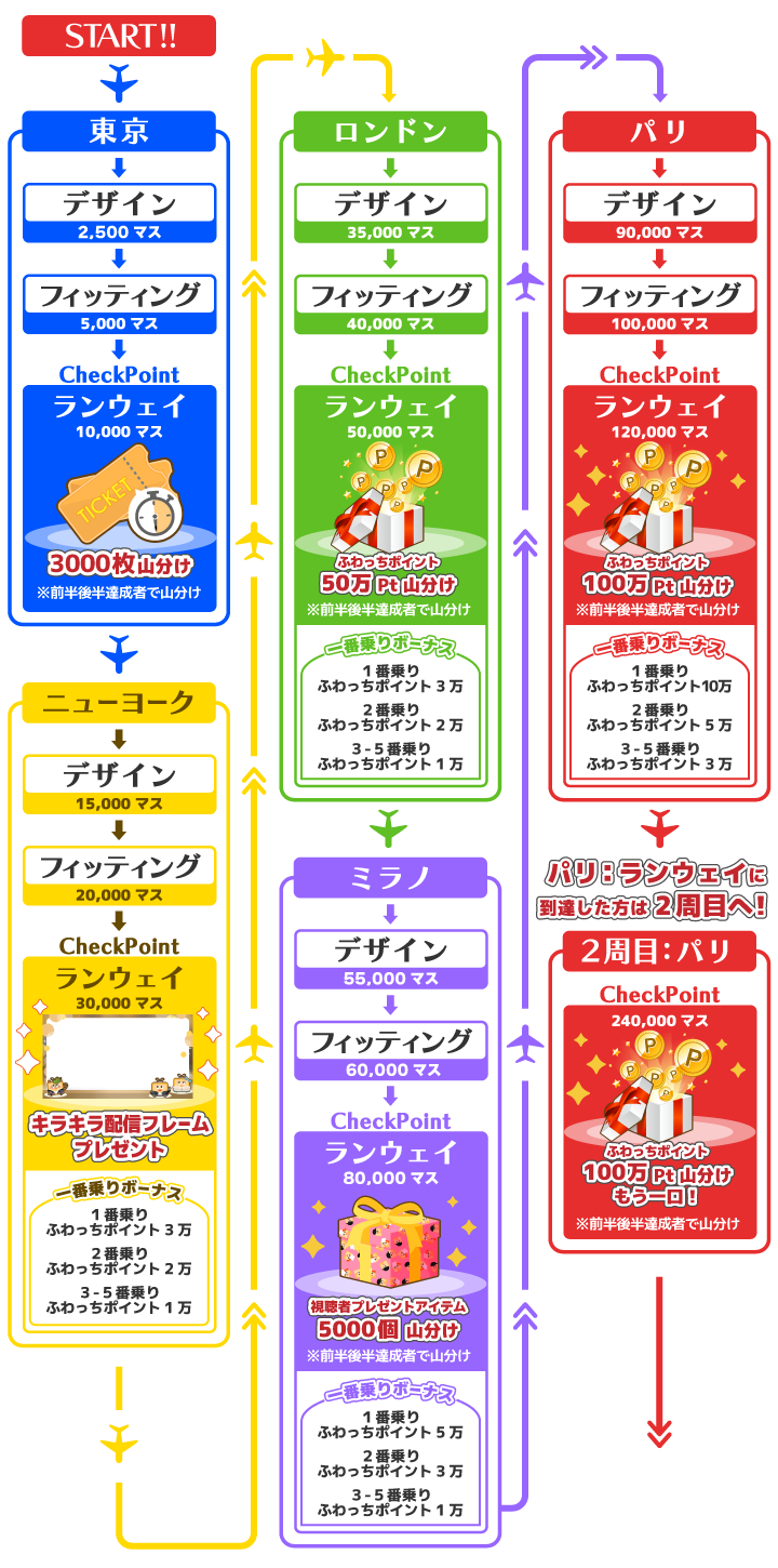 最終チェックポイントの2周目に到達すると、ふわっちポイント100万pt山分けの2口目の権利をゲットできます!