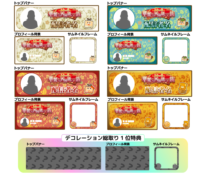 総取りランキングは、種類をまたいで「ぬいぐるみ」「デコレーション」と2つのカテゴリに分かれた各グレード別の総合ランキングにご参加いただきます。各グレード別の総合ランキングで1位に輝いた8名の配信者の方は参加したグループ以外の種類の特典を全てプレゼントいたします。