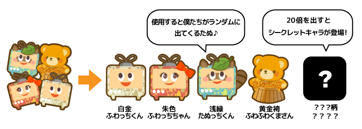- 通常・5倍・10倍では「白金ふわっちくん」「朱色ふわっちちゃん」「浅緑たぬっちくん」「黄金袴ふわふわくまさん」の4種類の絵柄がランダムにコメント欄に表示されます。各絵柄の出現確率は25%で均等です。絵柄による効果の違いはありません。