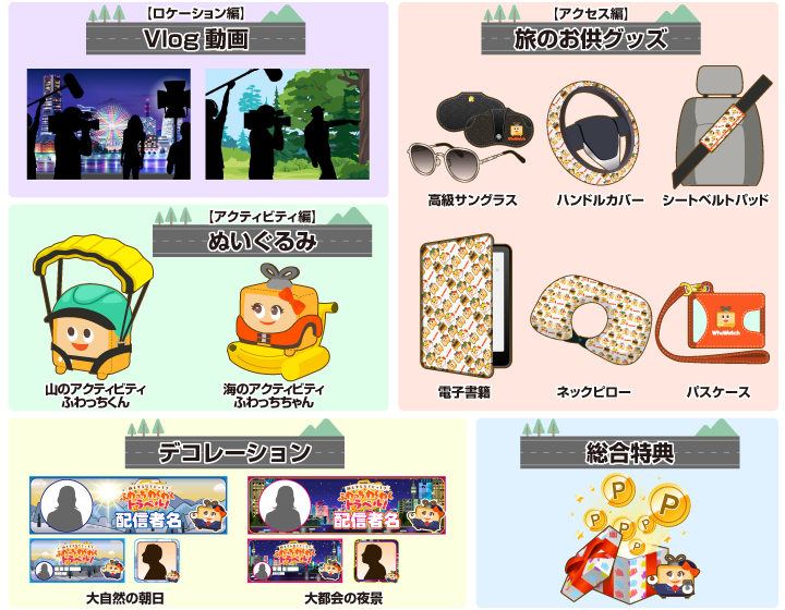 - イベント期間中に「ガイドふわっちちゃん」「トンでもない応援をするぶたさん」「イベント応援するゾウ!」「ワンチャン33倍の応援をするワンちゃんさん」をWebで購入するとでもらえるおまけアイテムです。
