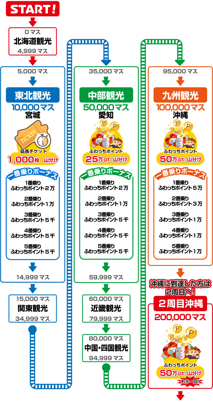 - イベント期間中、ランダムに出る当たりに応じて日本全国観光レースのマスポイントが変化します。(当選確率は以下の表をご参照ください。)