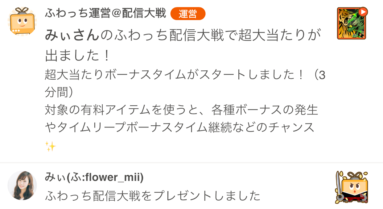 - 「ふわっち配信大戦」の各アイテムをそれぞれまとめて使った場合、ランキングポイントを決める抽選は1回だけ行います。 抽選により決定したランキングポイントの倍率は、まとめて使った「ふわっち配信大戦」の数量分適用されます。