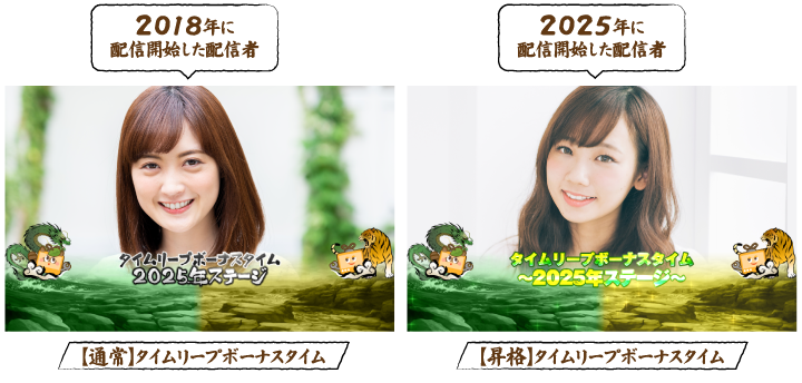 | ご自身の配信開始年以外の タイムリープボーナスタイム (通常) | ご自身の配信開始年の タイムリープボーナスタイム (昇格) | |||