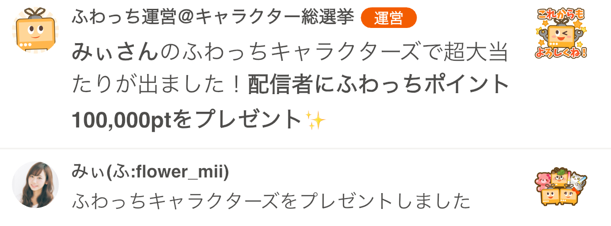 その枠の配信者にふわっちポイント10万ptを即時プレゼントします。