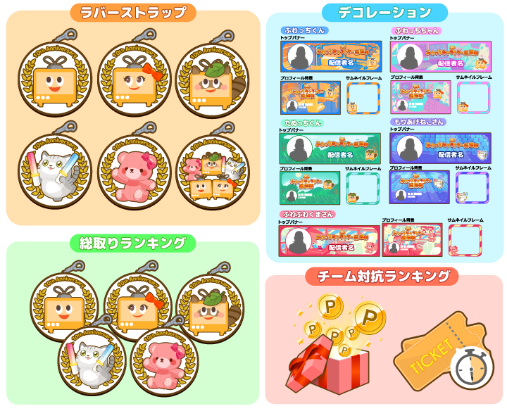 各キャラクターそれぞれグッズ、デコレーションセットをご用意、また、チームを横断したグレード毎のランキングで上位になると、グッズやデコレーションセットの全絵柄総取りのチャンスも!