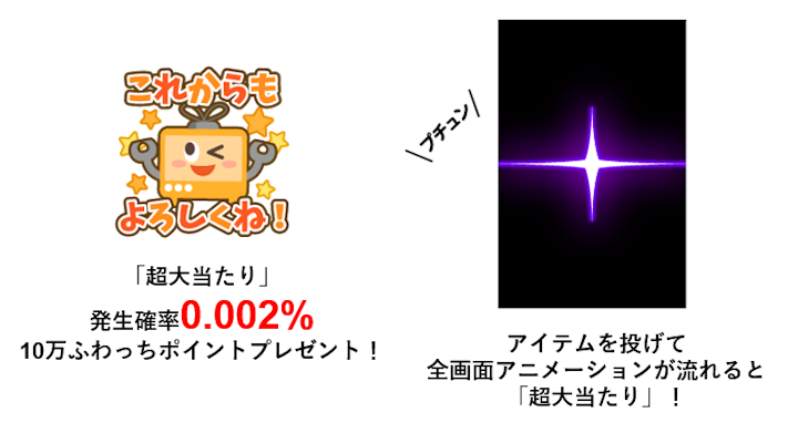 「超大当たり」が発生すると、音の鳴る全画面アニメーションが表示され、その配信の配信者にその場で、ふわっちポイント10万ptをプレゼントいたします。