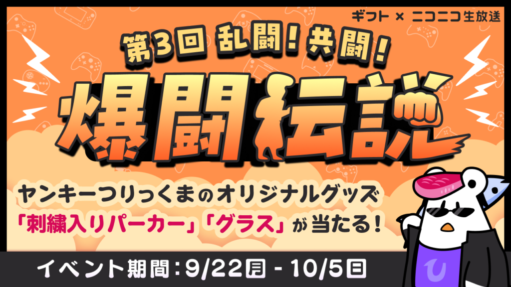 2025年9月22日(月)12:00~10月5日(日)23:59の期間中、ニコニコ生放送で『ギフト対応版爆闘伝説』(ニコ生ゲーム)をプレイし、一定のスコアを目指すイベントです。