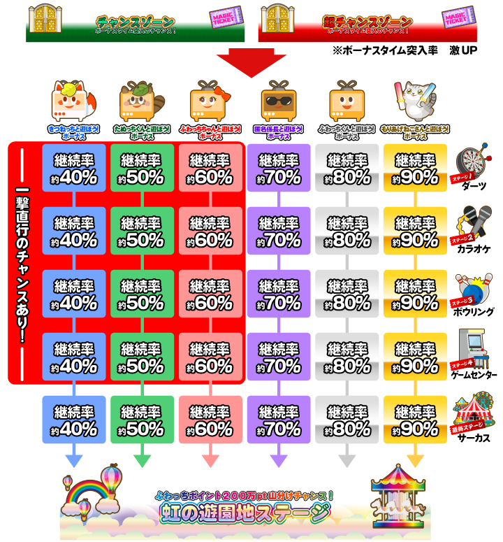 ボーナスステージは、6段階あり ダーツ → カラオケ → ボウリング → ゲームセンター → サーカス → 裏遊園地 の順番に昇格します。