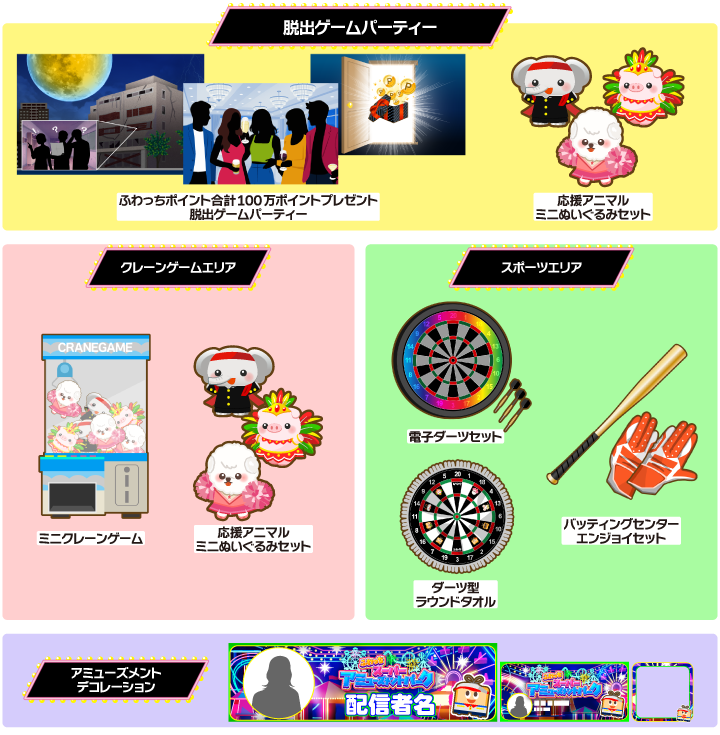 前半(2025年10月1日~6日)では、人気アミューズメントスポットをテーマに、豪華な食事とふわっちポイントが獲得できる脱出ゲームを楽しめる脱出ゲームパーティーへの参加権、ゲームセンターのクレーンゲームが楽しめるミニクレーンゲーム、応援アニマルのミニぬいぐるみセット、家庭でダーツが楽しめる電子ダーツセット、ダーツをモチーフにしたオリジナルラウンドタオル、バッティングセンターが楽しめるバッティングセンターエンジョイセットさらに、アミューズメントをモチーフにしたイベント限定デコレーションをご用意しました!