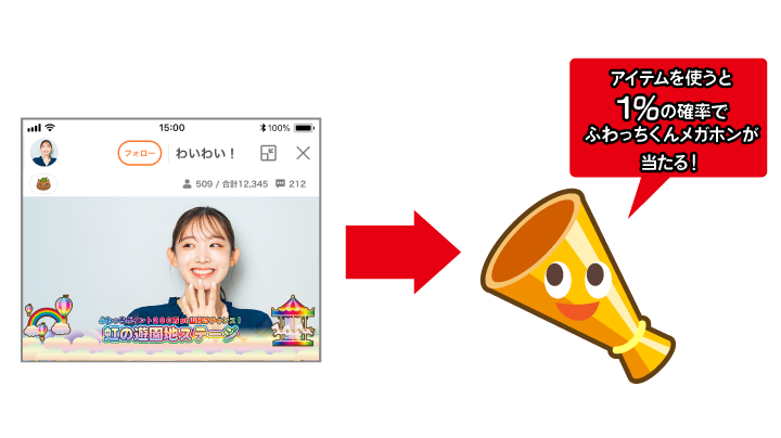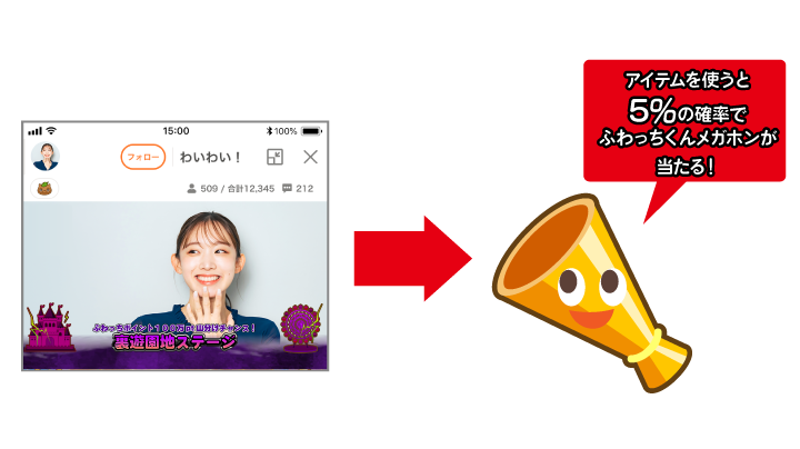 | 【配信者】 裏遊園地 山分けボーナス & 【視聴者】 ふわっちくんメガホン ![]() | – | – | 5% | あり |