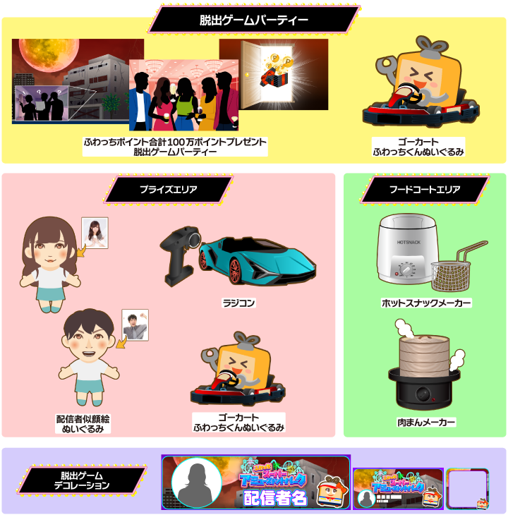 後半(2025年10月7日~11日)では、人気アミューズメントスポットをテーマに、豪華な食事とふわっちポイントが獲得できる脱出ゲームを楽しめる脱出ゲームパーティーへの参加権、入賞者ご本人のお写真を元に作られた似顔絵ぬいぐるみ、ご家庭で手軽にファストフードが作れるホットスナックメーカーと肉まんメーカー、スピード感抜群!大人も子供も楽しめる本格派ラジコンカー、ゴーカートに乗ったふわっちくんぬいぐるみ、脱出ゲームをモチーフにしたイベント限定デコレーションをご用意しました!