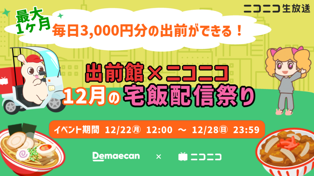 ニコニコ生放送にて「最大1ヶ月 毎日3,000円分の出前ができる! 出前館×ニコニコ 12月の宅飯配信祭り」を開催いたします。上位入賞者4名には宅飯配信が盛り上がる 「出前館クーポン」 をプレゼントいたします。1位入賞者にはなんと最大1ヶ月 毎日3,000円分の出前ができる分をプレゼント!宅飯を食べながらまったり雑談、ご飯の話題で盛り上がること間違いなし!