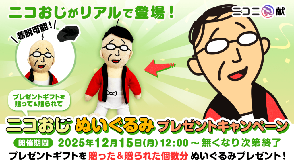 ユーザー生放送限定ギフトにおいて「プレゼント」ギフトを贈ると贈った個数分だけ、贈られると贈られた個数分だけ、ニコニ貢献キャラクターの「ニコおじ」ぬいぐるみが貰えるキャンペーンを実施します。