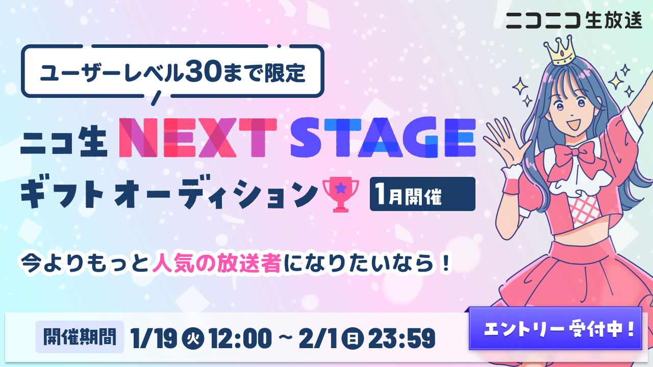 ニコニコ生放送にて、 「【ユーザーレベル30まで限定】ニコ生 NEXT STAGEギフトオーディション」を開催いたします。